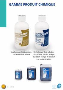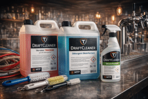 Les solutions DraftCleaner permettent un nettoyage efficace des lignes de bière en éliminant les dépôts et biofilms. Certaines formulations intègrent un traceur visuel, facilitant le contrôle de l’efficacité du nettoyage.